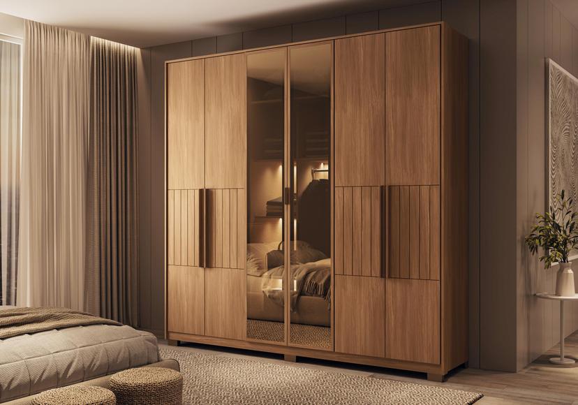 O Roupeiro Toronto Ultra produzido 100% em MDF, com pintura externa UV de alta resistência, garantindo durabilidade e excelente acabamento. Possui detalhes frontais com rebaixos usinados, portas centrais em MDF com vidro reflecta e puxadores metálicos e em MDF, que valorizam o design do móvel. Internamente, conta com divisão “Ele e Ela”, gavetas com corrediças telescópicas, cabideiros em alumínio e dobradiças com amortecimento para fechamento suave. Acompanha pés e oferece opção com iluminação LED.